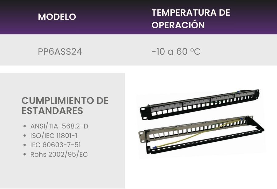 El Patch Panel cat 6A/Clase Ea Meridian de 24 puertos vacío permite una terminación modular y exible para soluciones de canal completo Meridian.Ideal para Cuartos de Telecomunicaciones y Centro de Datos usando módulos RJ45 (disponibles en su totalidad o en parte combinando con tapas ciegas modulares color negro). El patch panel puede soportar diferentes módulos de tal manera confgurarlo en una variedad de aplicaciones multimedia tales como (RJ45, RJ11, FO, audio/video, etc.. El Patch panel contiene un ordenador posterior que permite sostener todo tipo de cables y de todas dimensiones, un cable de conexión a tierra y en la parte superior de cada puerto la opción de colocar etiquetas de identicación, además de soportar iconos de identicación, debidamente protegidas con un bisel de plástico, para la correcta administración de acuerdo a los lineamientos de la Norma ANSI/TIA 606-C