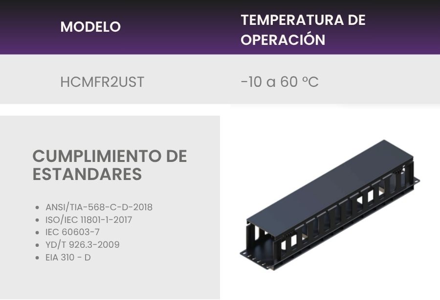 El Ordenador frontal horizontal de cables Meridian está diseñado de acuerdo a los lineamientos de la norma EIA 310 – D. Tiene de 19” de ancho, es rackeable y ocupa 2 UR; de plástico (ABS) muy resistente a los impactos de mayor duración dada su rigidez. Cuenta con 12 divisiones lo cual le permite una mayor holgura que los ordenadores convencionales. Es ideal para cuartos de telecomunicaciones y centro de datos donde se presentan gran cantidad de interconexiones.