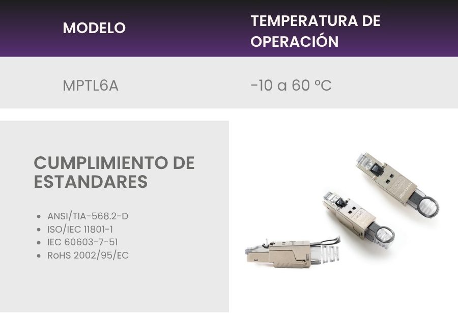 El conector plug cat 6A/Clase Ea Meridian ofrece una solución flexible y segura para enlaces terminados en campo para instalaciones de equipos de baja administración y/o movimiento, como cámaras de CCTV, controladores de acceso, medidores, sensores, Wifi, etc. Cumple y excede los lineamientos de los estándares ANSI/TIA e ISO/IEC que combinado con los demás componentes Meridian de cat 6A/Clase Ea ofrecemos al mercado una de las mejores Soluciones de rendimiento eléctrico que soportarán las aplicaciones 10 BASE-T (10 Megabits Ethernet a 100 m), 100 BASE-T (100 Megabits Fast Ethernet a 100 m), 1000 BASE-T (1000 Megabits Ethernet a 100 m), 10G BASE-T (10 Gigabit Ethernet a 100 m) e IEEE 802.3af/at/bt – PoE (Power Over Ethernet).