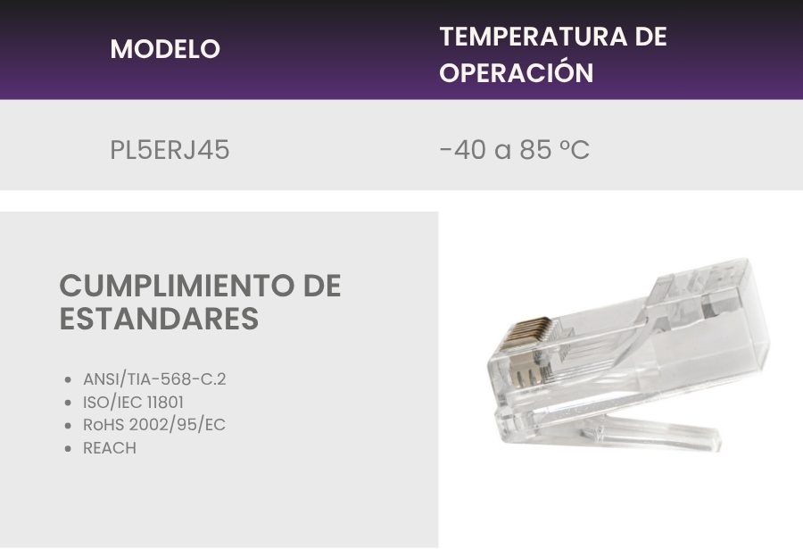 El conector RJ45 tipo macho (Plug) Meridian está diseñado de acuerdo a los lineamientos de la ANSI/TIA 568-C.2 para cat 5e e ISO/IEC 11801 para Clase D especificada para trabajar a un máximo ancho de banda de 100 Mhz y hasta una distancia de 100 metros.