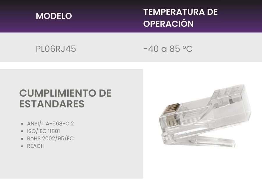 El conector RJ45 tipo macho (Plug) Meridian está diseñado de acuerdo a los lineamientos de la ANSI/TIA 568-C.2 para cat 6 e ISO/IEC 11801 para Clase E especificada para trabajar a un máximo ancho de banda de 250 Mhz y hasta una distancia de 100 metros.